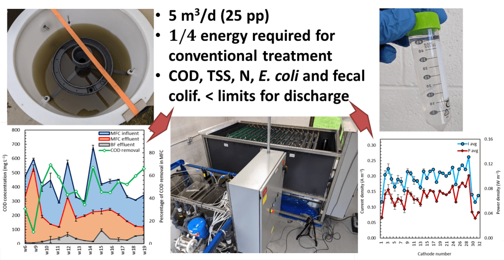 Around 600 billion kWh of energy are contained in the organic matter of the 300 billion m3 per year of domestic wastewater generated worldwide considering an average energy content of 2 kWh m–3, making the recovery of the energy contained in these waste streams a compelling opportunity to achieve a circular economy and diminish the high energy cost of wastewater treatment. Microbial fuel cells (MFCs), microbial electrolysis cells (MECs), microbial electrosynthesis (MES) cells can recover the energy contained in the wastewater and transform it in electricity (MFCs), hydrogen (MECs) or valuable products (MES) such as methane, acetate, or other organic molecules. We are primarily working on bringing these electrochemical cells out of the lab, operating in real condition at a commercial scale. Coupling electrochemical engineering, microbiology and environmental engineering, we developed, installed, and operated the largest air cathode MFC, producing useful electricity while treating domestic wastewater.