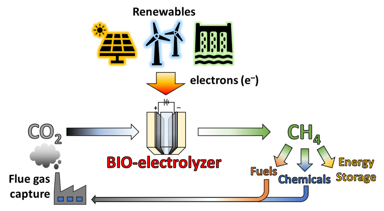 Methane and carbon dioxide are major greenhouse gases than contribute to climate change. Both these molecules are very stable and their poor reactivity limits utilization and transformation in other, more valuable chemical products. We are exploring abiotic and living catalysts to facilitate the production of liquid valuable products from waste CO2 and CH4 feedstocks. On the CO2 side, we are developing novel approaches, aided by AI, to capture and upgrade inorganic carbon in water reclamation facilities, producing volatile fatty acids that can be used as building blocks for the chemical industry. On the CH4 side, we are using methanotrophs and novel abiotic catalysts for the production of C2+ chemicals.